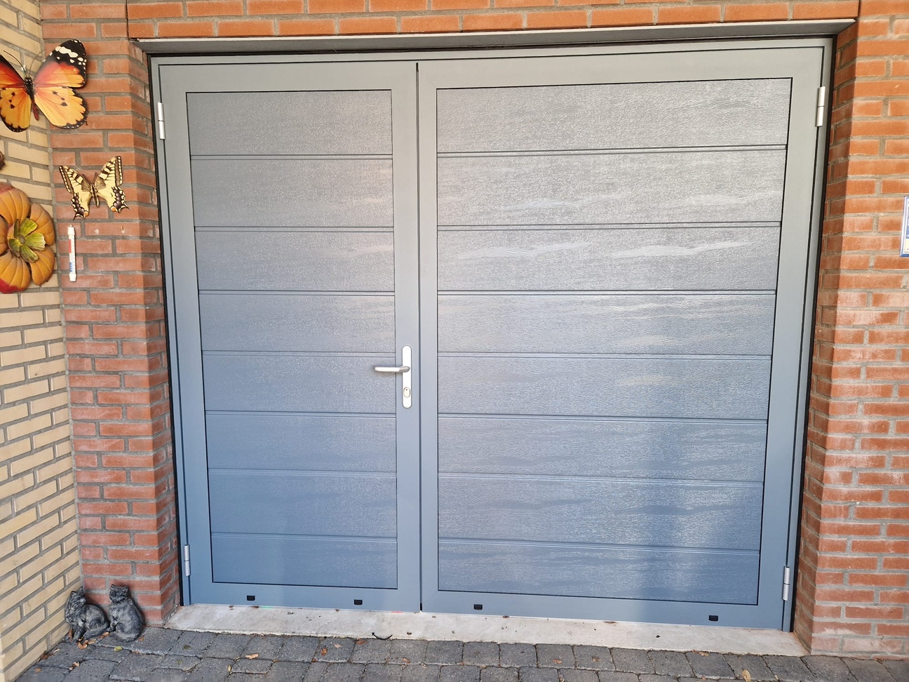 Panelen verticaal geplaatst – Geeft de openslaande garagepoort een andere uitstraling en kan worden afgestemd op het gevelbeeld.