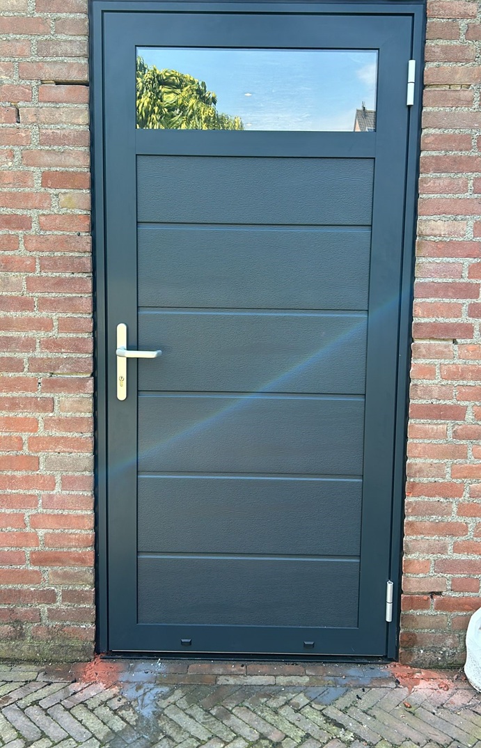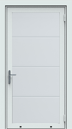 Deze enkele openslaande poort is opgebouwd uit 40 mm dikke geïsoleerde panelen en functioneert als een loopdeur in openslaand model. De maximale breedte is 1500 mm. De poort kan in dezelfde uitvoeringen, structuren en kleuren geleverd worden als de dubbele openslaande poorten. Standaardkleur is RAL 9016.