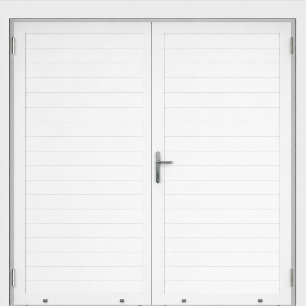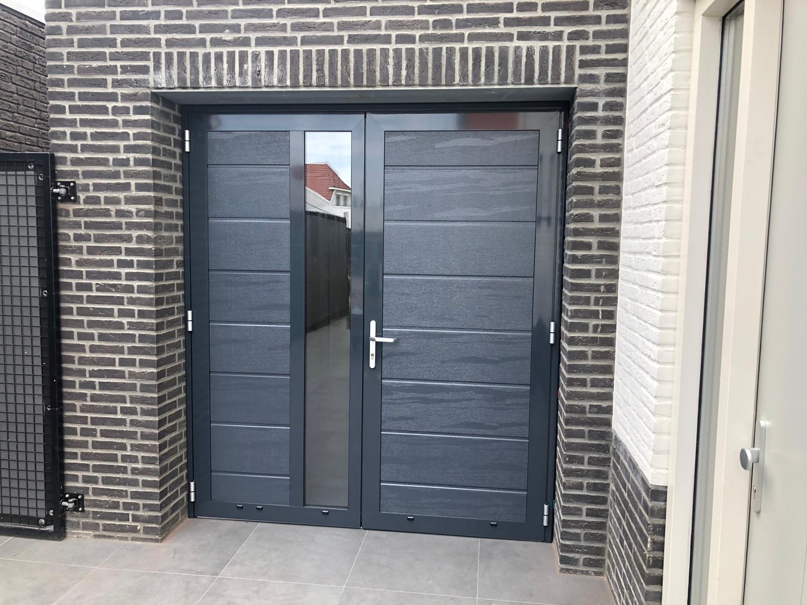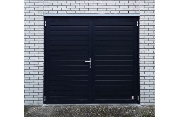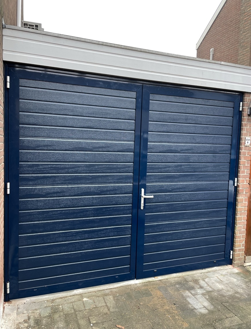 Deze openslaande poorten zijn opgebouwd uit 40 mm dikke geïsoleerde panelen en zijn uitgevoerd met ongelijke delen. Hierdoor kun je zelf bepalen hoe breed de loopdeur of het vaste deel wordt, met een maximale breedte van 1500 mm. Standaardkleur is RAL 9016.