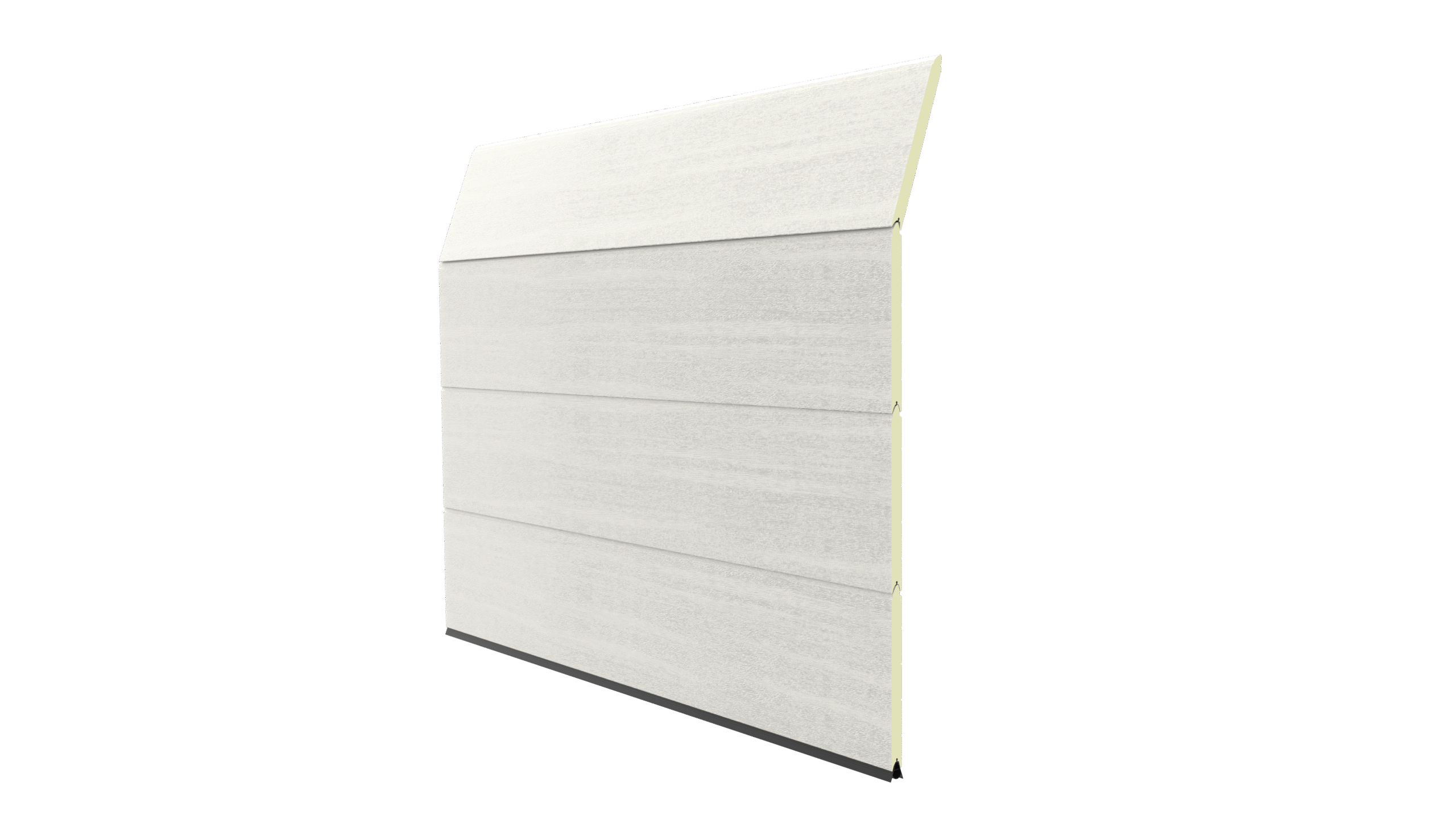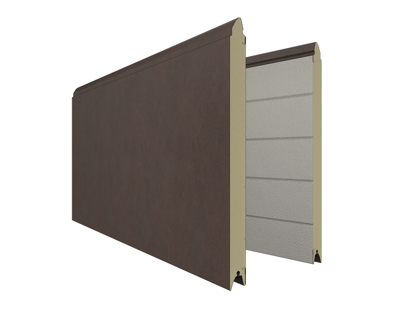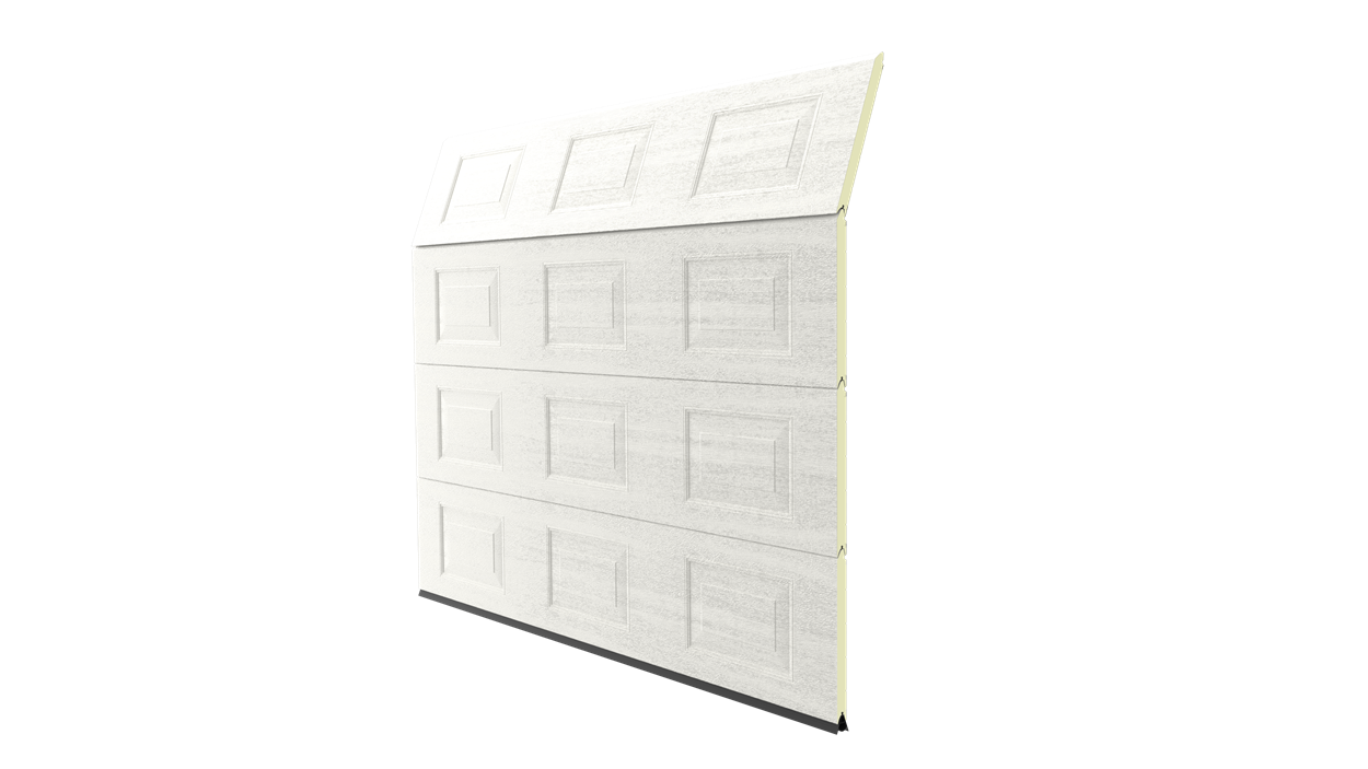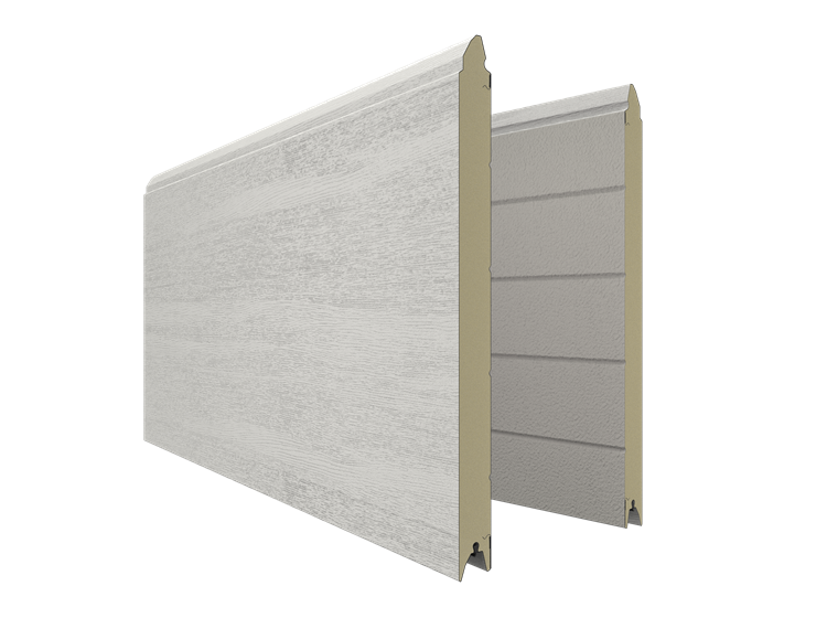 Deze 40 mm dikke geïsoleerde garagepoort is uitgevoerd zonder horizontale belijning, maar voorzien van een woodgrainstructuur. Standaardkleuren zijn RAL 9016 en RAL 7016.