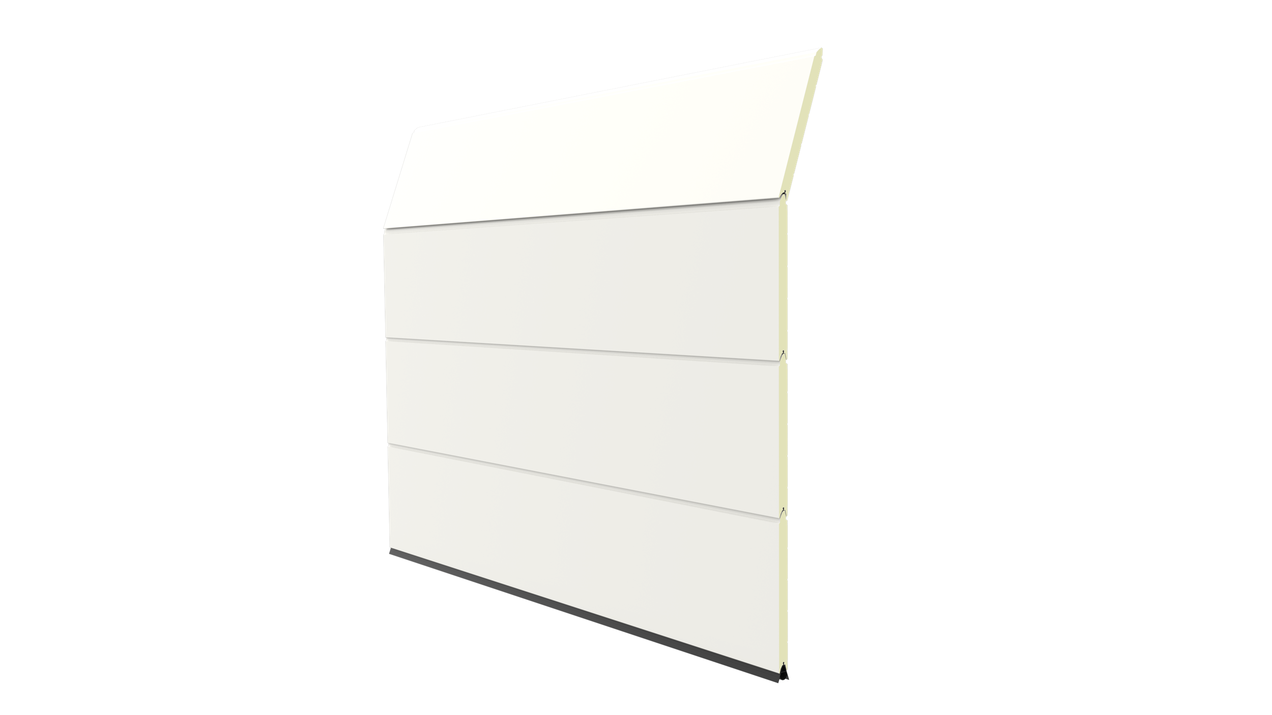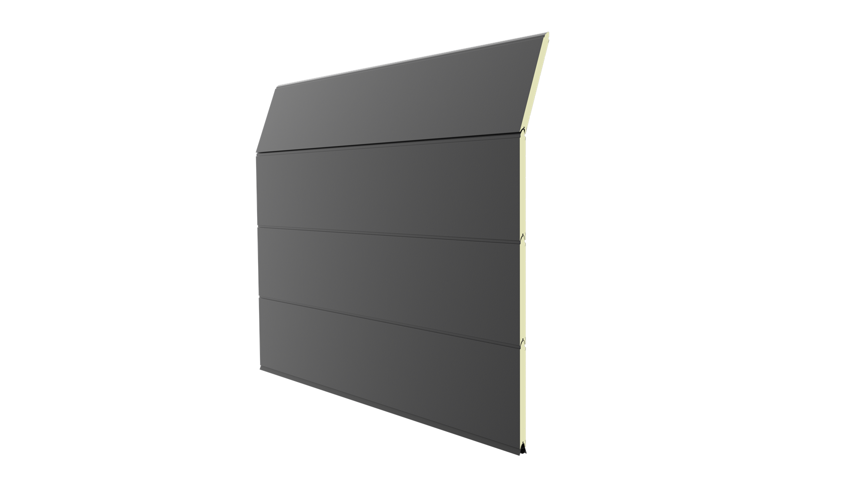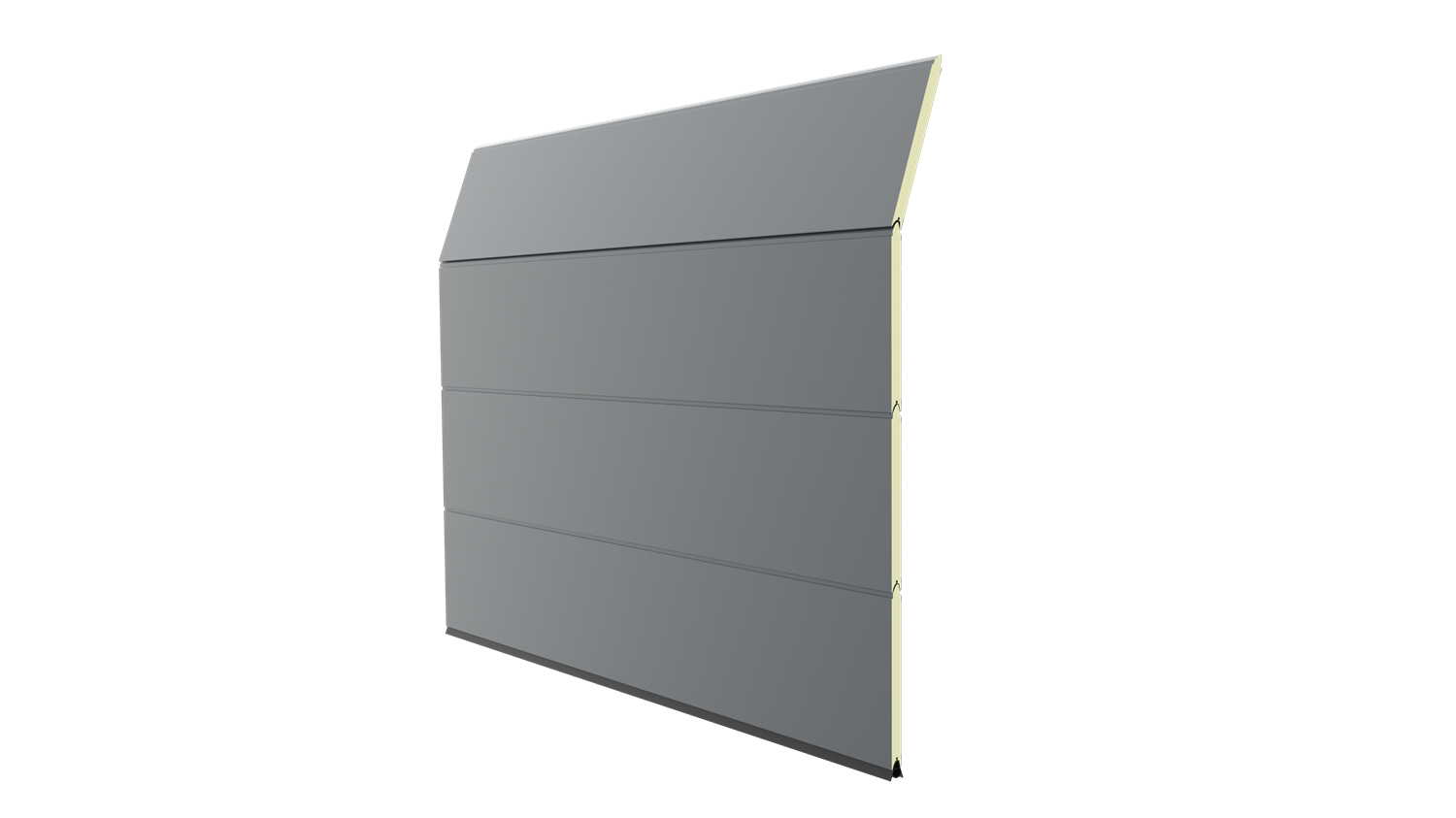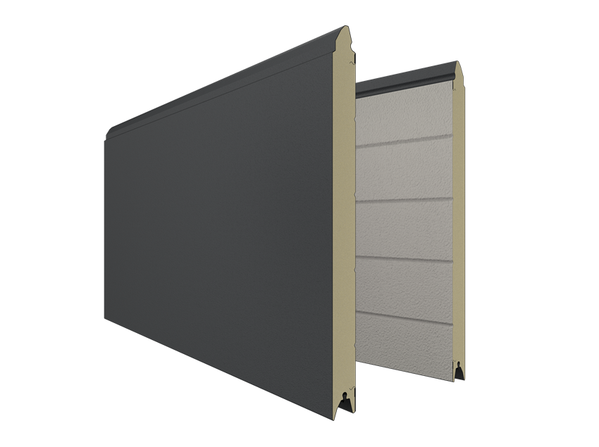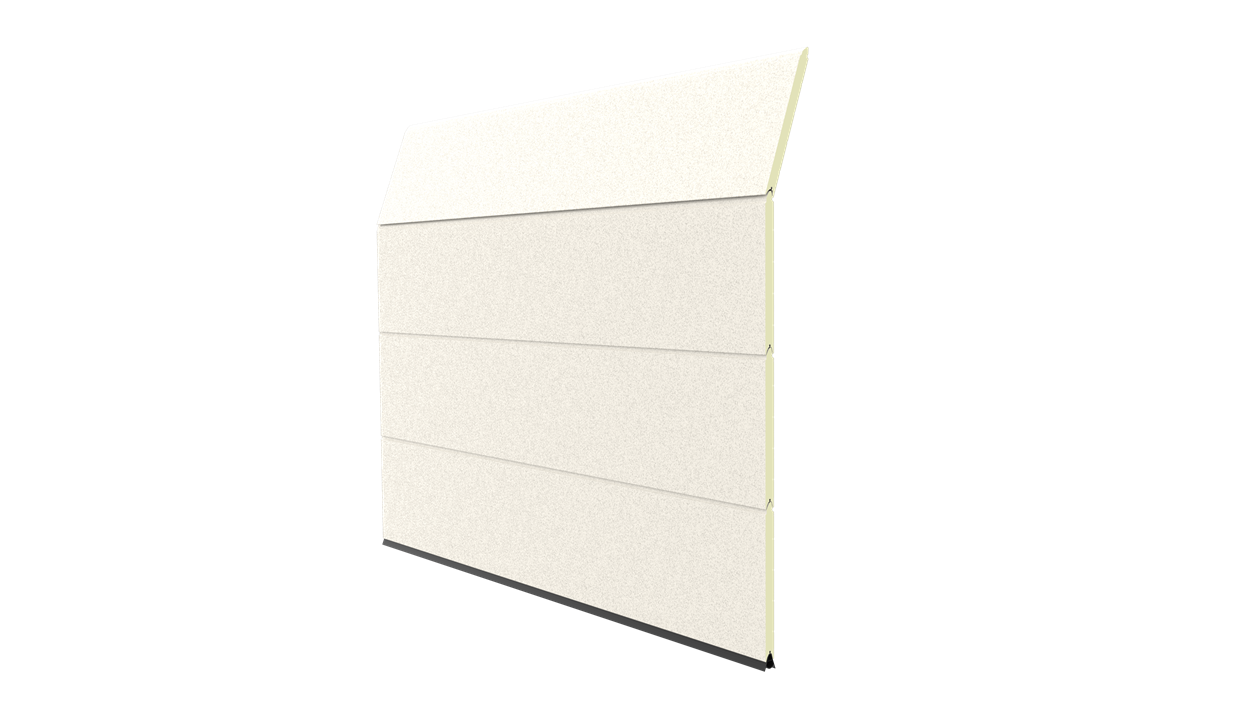 Deze 40 mm dikke geïsoleerde garagepoort is uitgevoerd zonder horizontale belijning en het oppervlak is glad. Standaardkleuren zijn RAL 9016, 7016, 9005, 9006 en 9007.