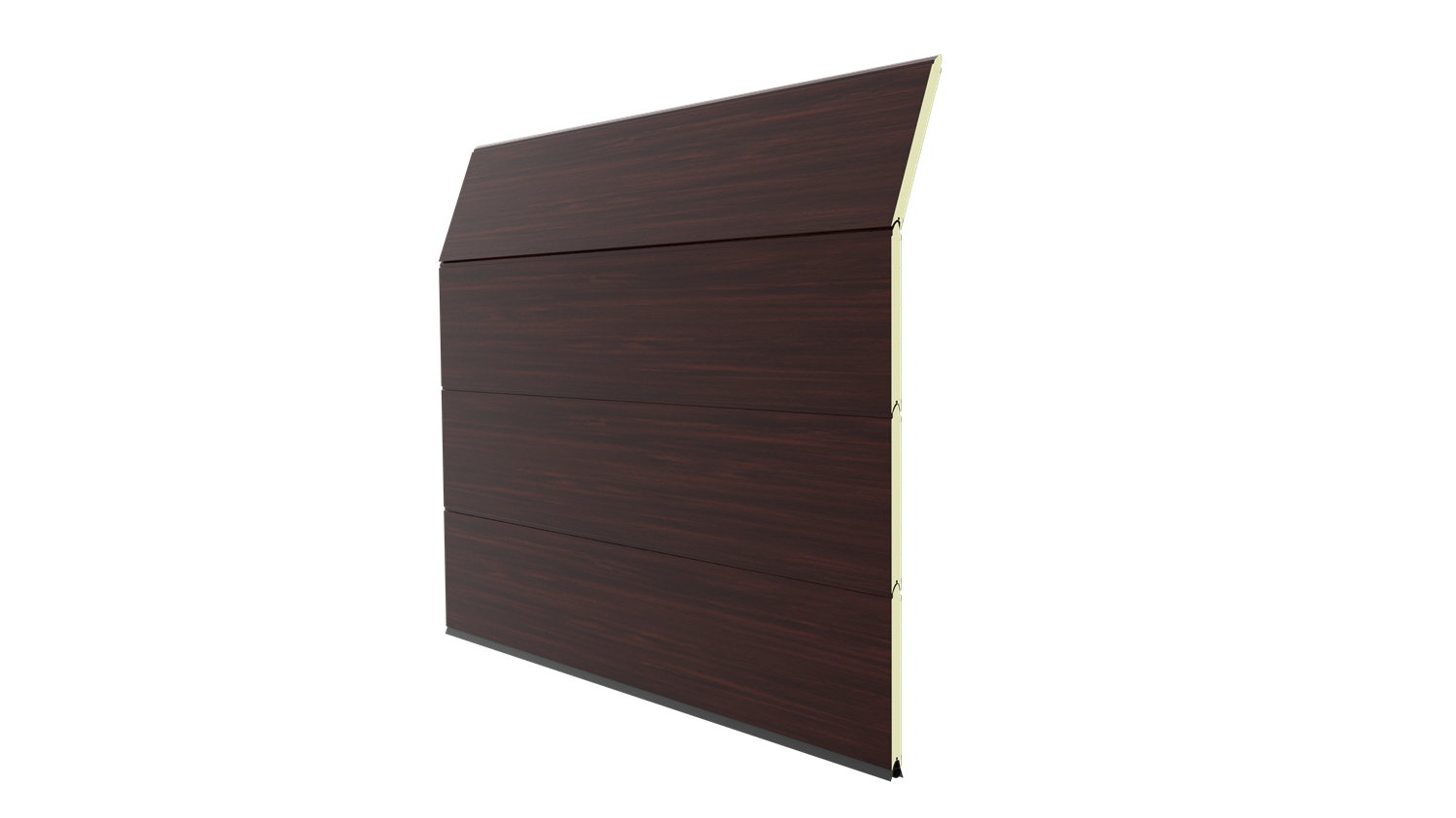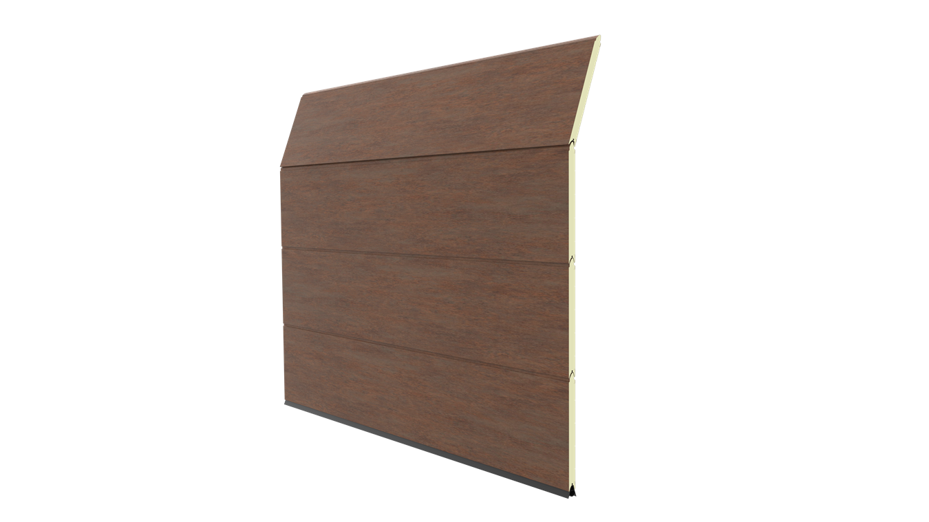 Deze openslaande poorten zijn opgebouwd uit 40 mm dikke geïsoleerde panelen met per paneel één diepe horizontale belijning en een woodgrainstructuur. Standaardkleur is RAL 9016.
