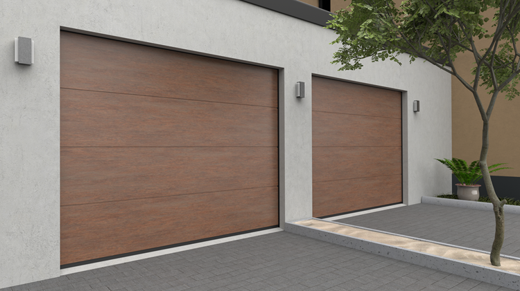 Deze 40 mm dikke geïsoleerde garagepoort is uitgevoerd met één diepe horizontale belijning. De Wood-Line panelen zijn nauwelijks van echt hout te onderscheiden en geven uw huis een geraffineerde sfeervolle uitstraling.
