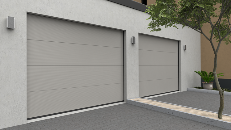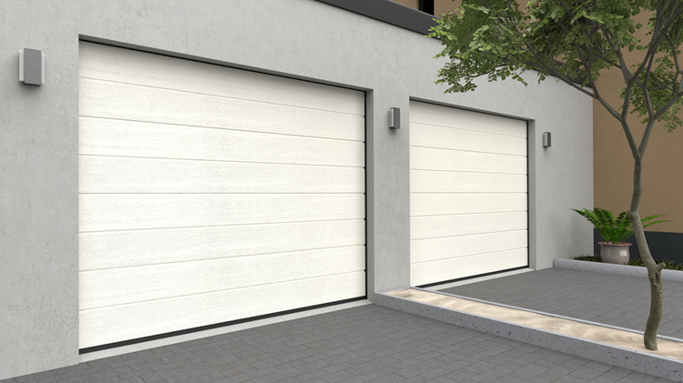 Deze 40 mm dikke geïsoleerde garagepoort heeft per paneel één diepe horizontale belijning en een woodgrainstructuur. Standaardkleuren zijn RAL 9016 en RAL 7016.
