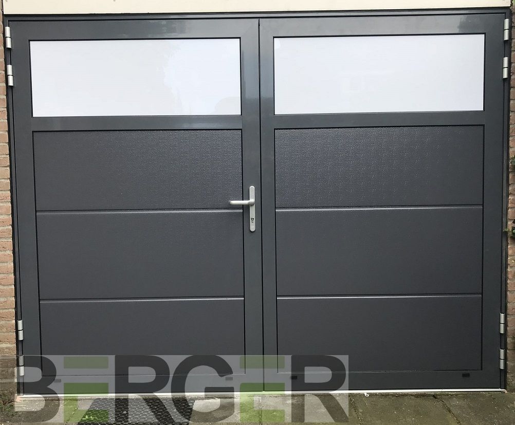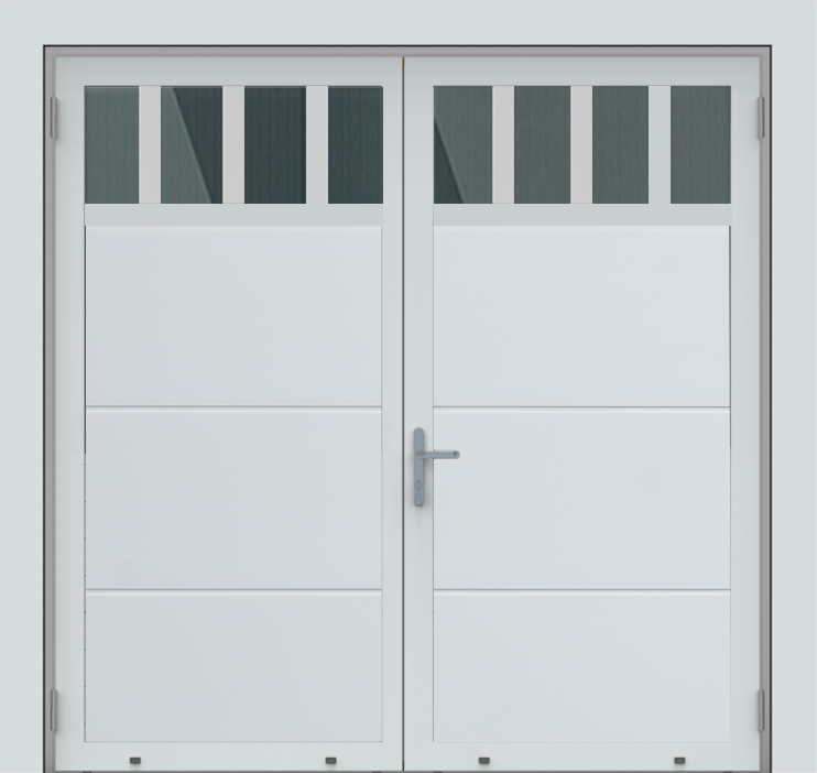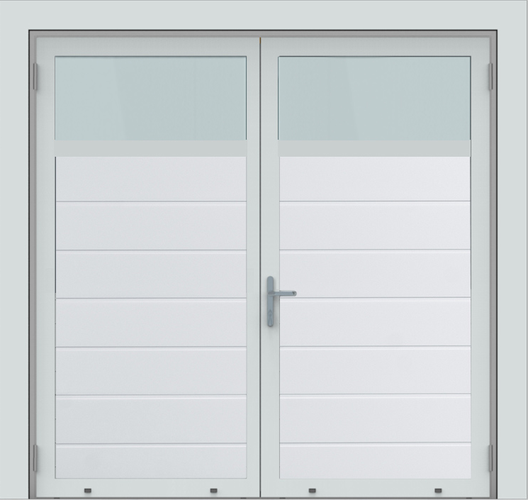 Deze openslaande poorten zijn opgebouwd uit 40 mm dikke geïsoleerde panelen en uitgevoerd met een horizontaal glaspaneel in beide poortvleugels. Standaardkleur is RAL 9016.