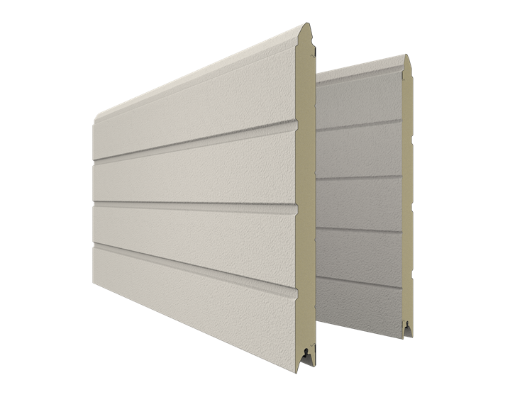 Deze openslaande poorten zijn opgebouwd uit 40 mm dikke geïsoleerde panelen met meerdere diepe horizontale belijningen en zijn voorzien van een stuccostructuur. Standaardkleur is RAL 9016.