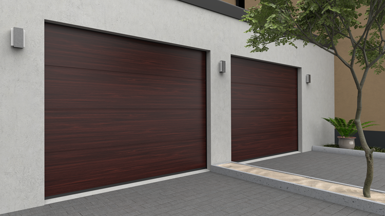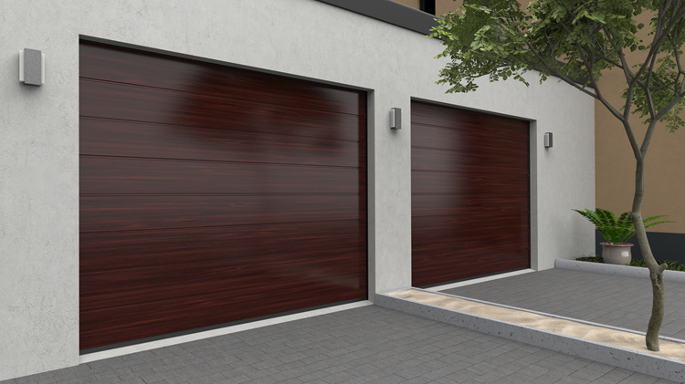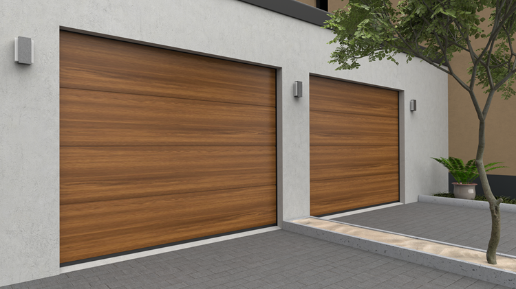 Deze 40 mm dikke geïsoleerde garagepoort is uitgevoerd zonder horizontale belijning. De Wood-Line panelen zijn nauwelijks van echt hout te onderscheiden en geven uw huis een geraffineerde sfeervolle uitstraling.