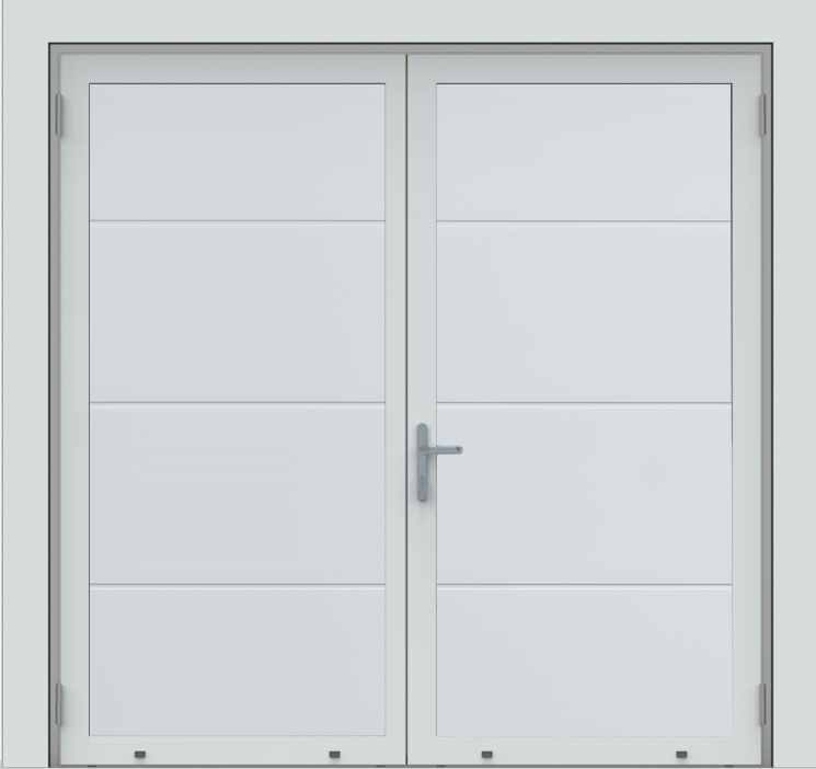 Deze openslaande poorten zijn opgebouwd uit 40 mm dikke geïsoleerde panelen met één diepe horizontale belijning en het oppervlak is glad uitgevoerd. Standaardkleur is RAL 9016.