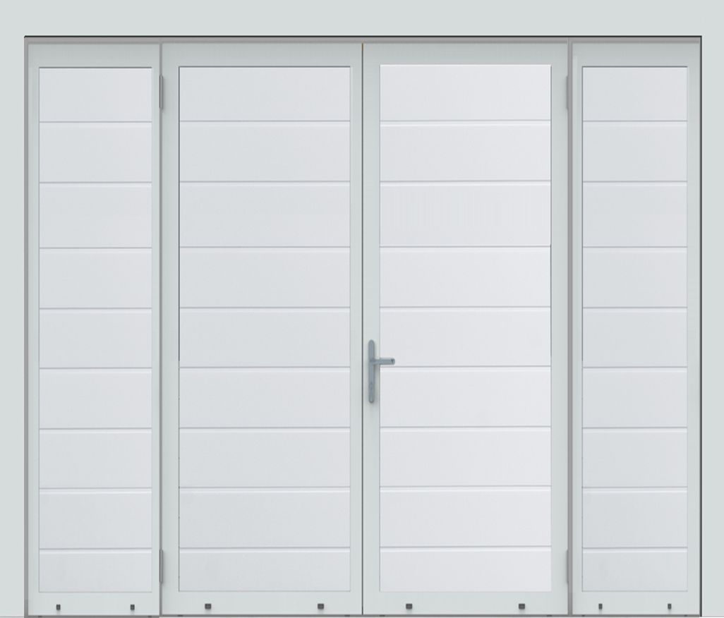 Deze 40 mm dikke geïsoleerde openslaande poorten zijn uitgevoerd met 2 vaste zijpanelen. Hierdoor kun je breder gaan dan de maximale breedte van 3000mm.