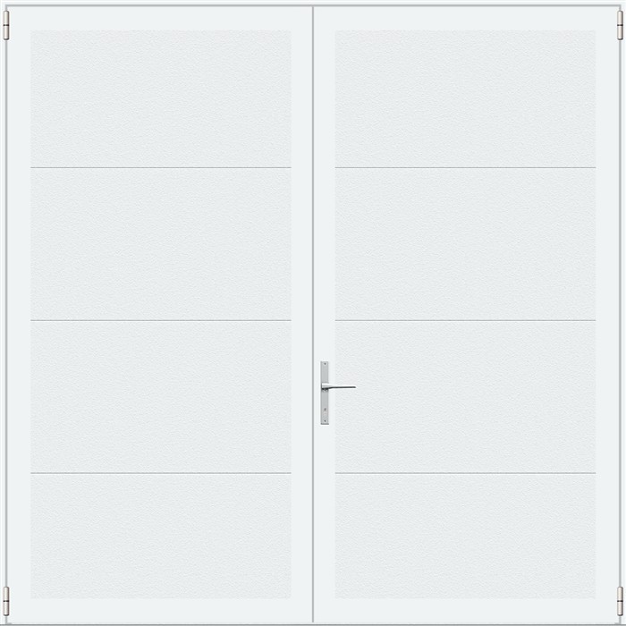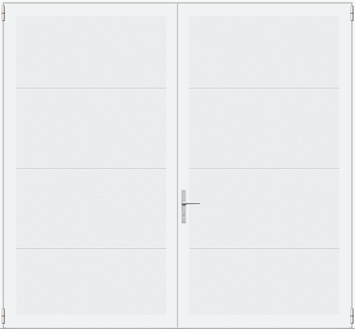 Deze openslaande poorten zijn opgebouwd uit 40 mm dikke geïsoleerde panelen zonder extra horizontale belijningen en zijn voorzien van een stuccostructuur. Standaardkleur is RAL 9016.