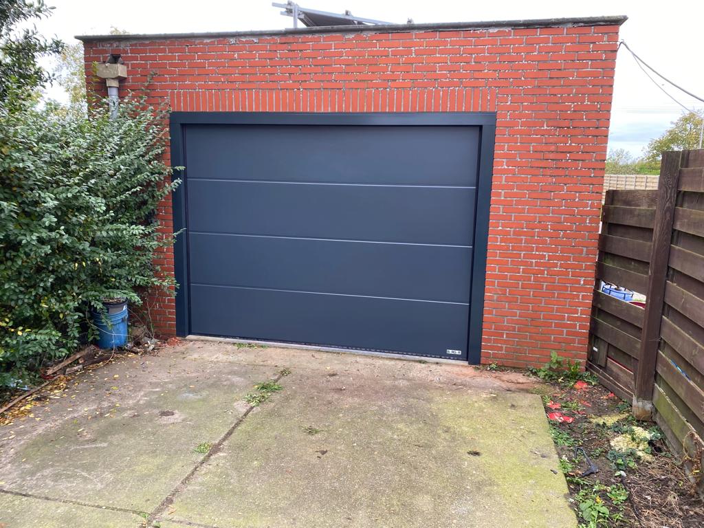 Bij een van onze klanten hebben wij een sectionale garagepoort geleverd en gemonteerd, voorzien van een 3-zijdig montageprofiel. In België komt zogenoemde “achter de slag”-montage regelmatig voor. Deze montagetechniek biedt bij sectionale garagepoorten vaak weinig tot geen ruimte voor standaard montage. In dergelijke situaties passen wij een 3-zijdig montageprofiel toe, waardoor montage alsnog technisch correct mogelijk is. Het montageprofiel is gepoedercoat in de kleur van de garagepoort, wat zorgt voor een strak en compleet geheel.