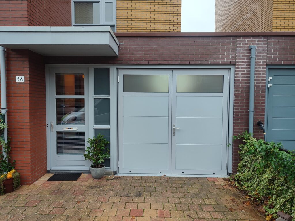 Deze klant oriënteerde zich eerst op een sectionale garagepoort met loopdeur. Tijdens het adviestraject bleek dat openslaande poortenbeter pasten bij de woning en de uitstraling van de gevel. De poorten zijn uitgelijnd met de voordeur voor een rustig en samenhangend geheel. Uitgevoerd met Satin Plano panelen en een glassectie met gesatineerd dubbel hardglas in RAL 7040 mat fijnstructuur. Naar aanleiding van dit project hebben wij in dezelfde straat nog twee families mogen helpen.