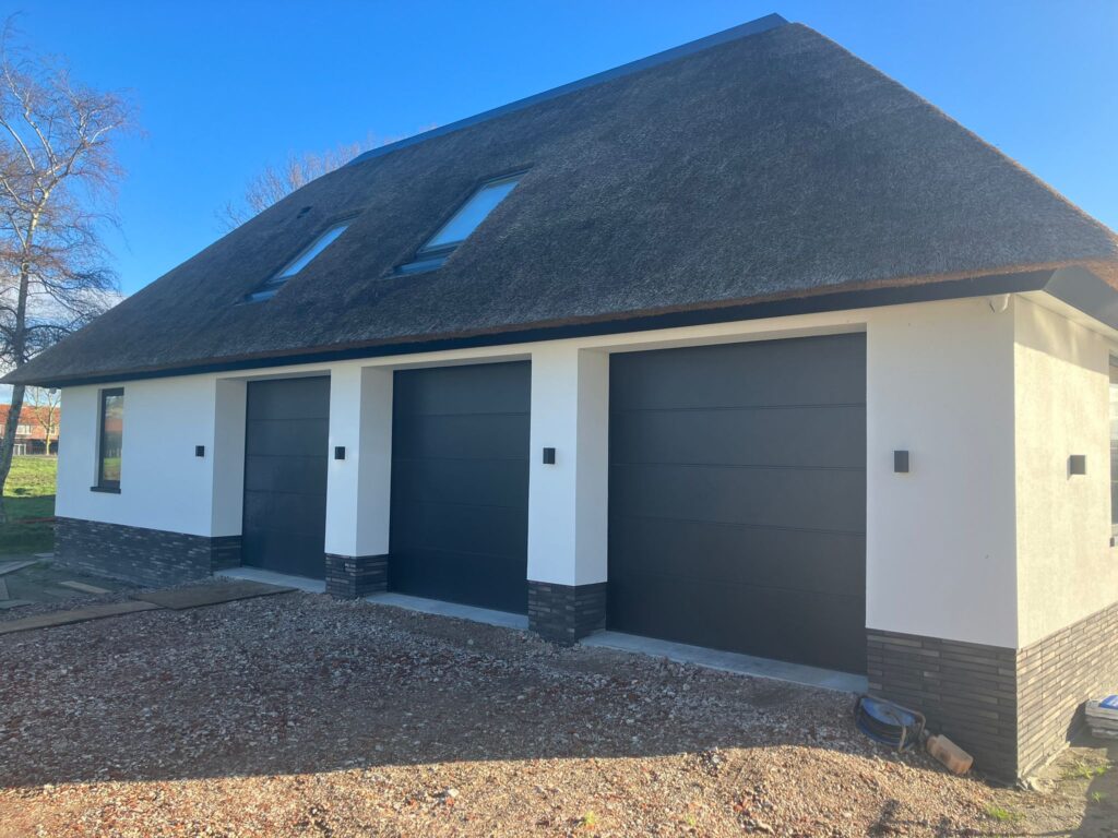 De klant heeft een garage gebouwd voor zijn oldtimers, waarbij iedere auto beschikt over een eigen garagepoort. De garagepoorten worden bediend met één handzender en zijn uitgevoerd met Satin Plano panelen in de kleur RAL 9004, afgewerkt in mat fijnstructuurlak. Ten tijde van het maken van de foto was de bestrating nog niet aangebracht, maar de uitstraling is nu al zeer fraai.