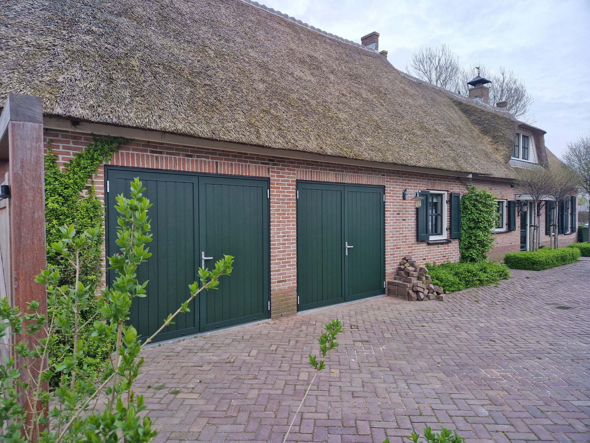Voor een oude boerderij hebben wij twee nieuwe openslaande poorten mogen leveren en monteren. De poorten zijn uitgevoerd met Woodgrain Plancha panelen, verticaal geplaatst, wat perfect aansluit bij het karakter van het gebouw. De gekozen kleur RAL 6009 in mat fijnstructuurlak geeft de deuren een authentieke uitstraling, gecombineerd met het comfort en gemak van onderhoudsvrije materialen.