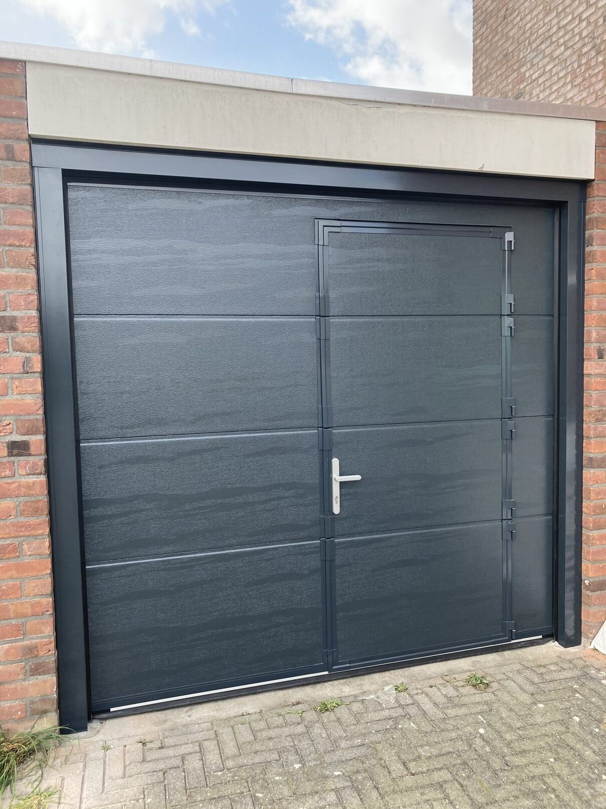 Deze klant koos voor een garagepoort met loopdeur vanwege het ontbreken van een achterom. Zo kunnen de kinderen eenvoudig en veilig via de loopdeur naar binnen en buiten. Omdat montage op de dag aan de binnenzijde niet mogelijk was, is vooraf een 3-zijdig montageprofiel geplaatst in de kleur van de garagepoort. Een functionele en esthetische oplossing met veel gebruiksgemak.